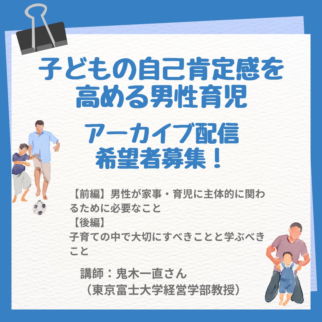 いたばしI(あい)カレッジ男性版「子どもの自己肯定感を高める男性育児」配信希望者募集10月25日、30日に板橋区立グリーンホールで開催した「子どもの自己肯定感を高める男性育児」のアーカイブ動画を期間限..