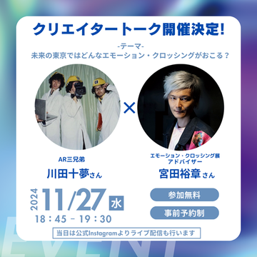 【参加無料・11/27(水)18:45開催】有楽町駅前「SusHiTechSquare」にてAR三兄弟の川田十夢さん・慶應義塾大学教授の宮田裕章さんのトークイベント開催。未来を創るクリエイティブな視点..