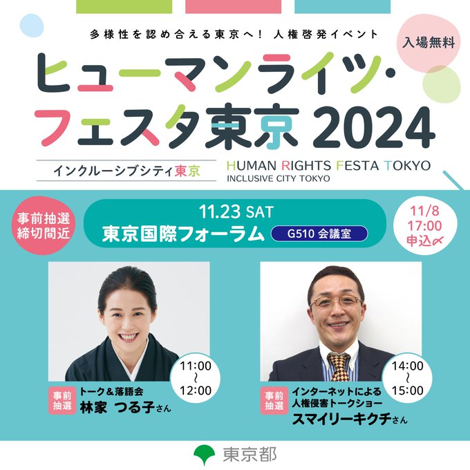 \締切間近ヒューマンライツ・フェスタ東京2024/11/23(土)・11/24(日)に開催する東京国際フォーラム会場の事前抽選申し込みは【11/8(金)17:00まで】となります!この機会をお見逃しな..