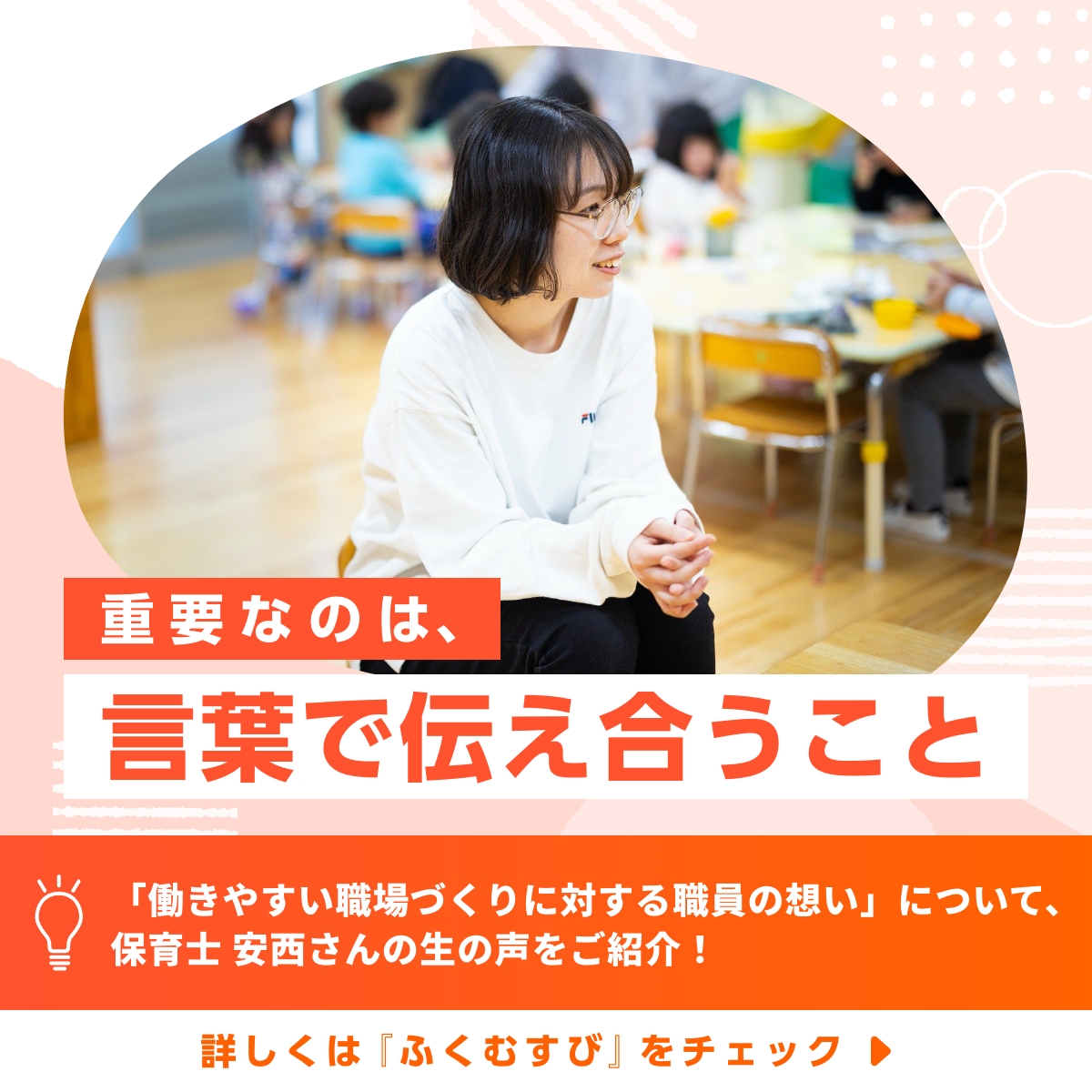 \\働く職場づくり編「重要なのは、言葉で伝え合うこと」//「働きやすい職場づくりに対する職員の想い」について、前回に引き続き保育士安西さんの生の声をご紹介!詳しくは下記ページをチェックhttps://..