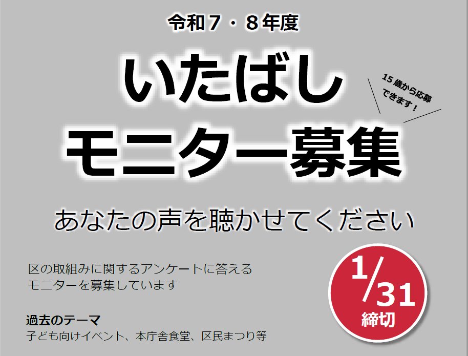 【令和7・8年度の「いたばしモニター」を募集】区の取組に関する簡単なアンケート等に答えるモニターさんを募集しています。ホームページより申し込みができますので、モニターに参加して区への意見をお聴かせくだ..