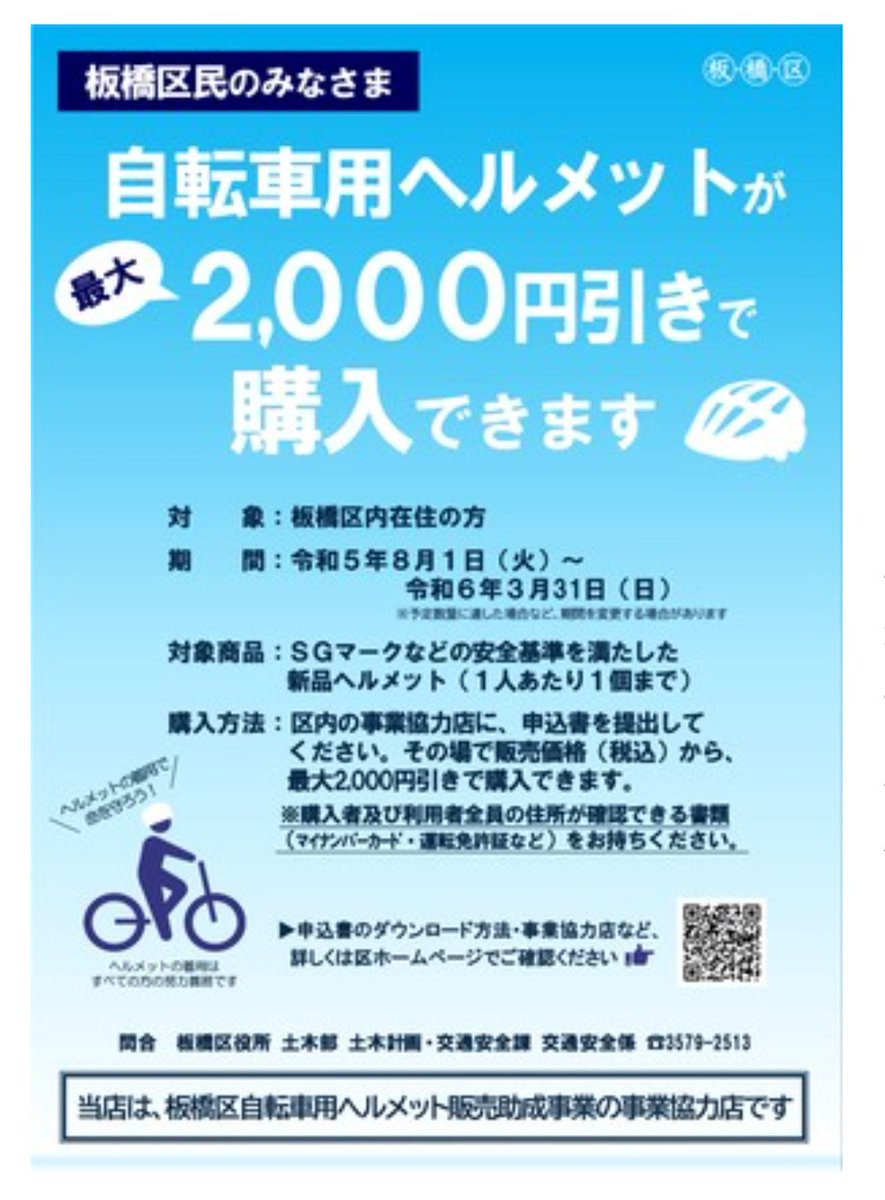 【自転車用ヘルメット助成スタート✨】8月1日から自転車用ヘルメットの助成が始まります。www.city.itabashi.tokyo.jp/b..⚠️板橋区内の個人自転車販売店、イオンバイクのみでの対..