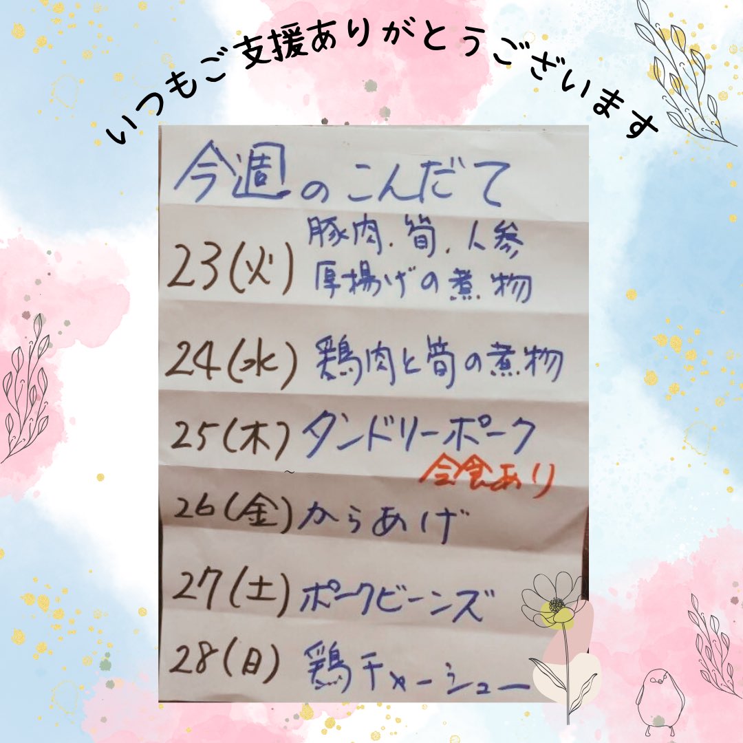 では、4/23(火)からのメインリストをアナウンスします📣今週のテーマは…『🍖お肉パラダイス〜旬の食材を添えて〜🍖』今日の大皿は、まい食のメインで決まりっ☘️💫皆さんの食卓をキラキラに彩れますように💫..