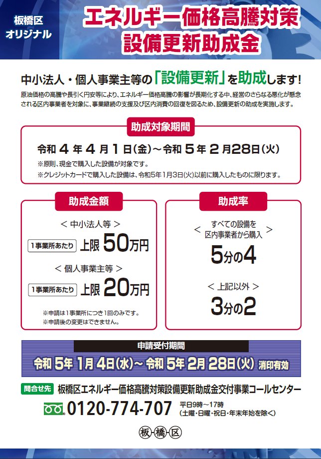 ▽エネルギー価格高騰対策設備更新助成金 交付事業実施のお知らせ令和5年1月4日(水)より原油価格の高騰や長引く円安等、エネルギー価格高騰の影響が長期化する中、経営のさらなる悪化が懸念される区内事業者を..