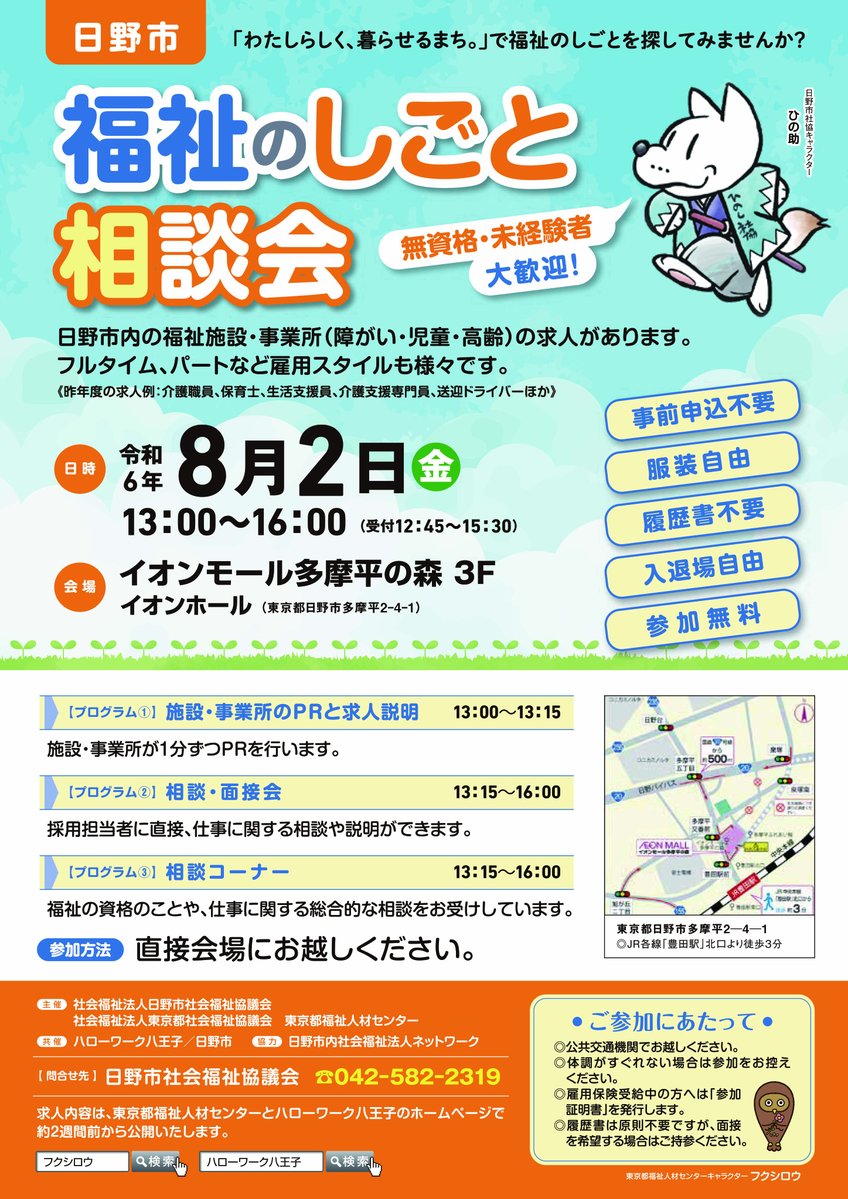 【日野市「福祉のしごと相談会」開催】「地元で福祉の仕事がしたい」を応援します!令和6年8月2日(金)/13:00~16:00/イオンモール多摩平の森3F■求人概要は、東京都福祉人材センターのホームペー..