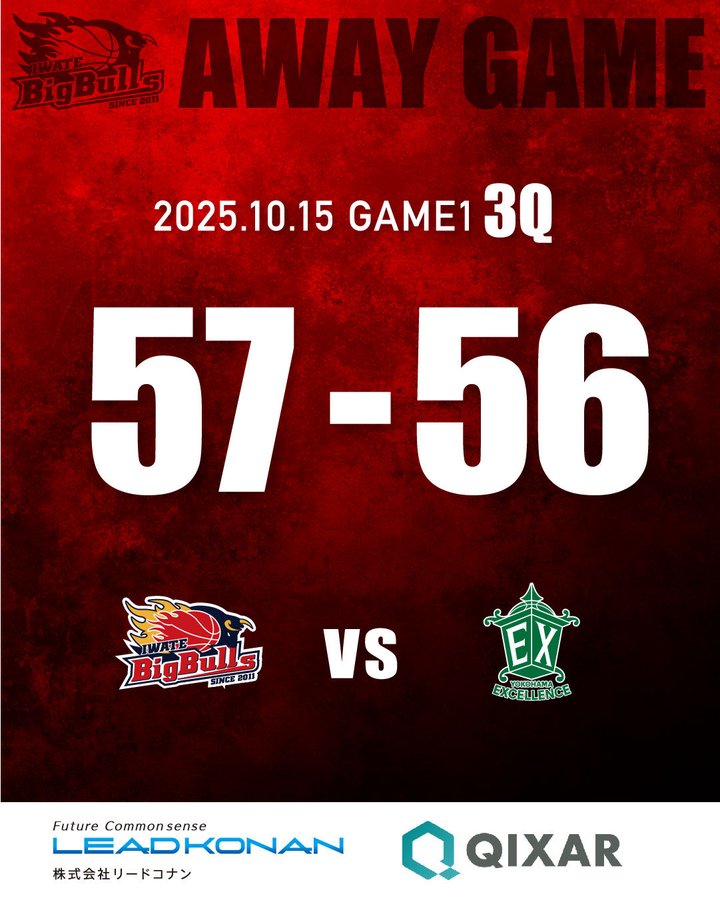 2025.10.15[WED] #岩手ビッグブルズ #横浜エクセレンス ◤3Q終了◢ 岩手57-56横浜EX バスケットLIVE https://basketball.mb.softbank.jp/lives/505538?utm_source=club&utm_medium=IB&utm_campaign=club_IB_006… #岩手ビッグブルズ #bigbulls #ONEGO #ワンゴー