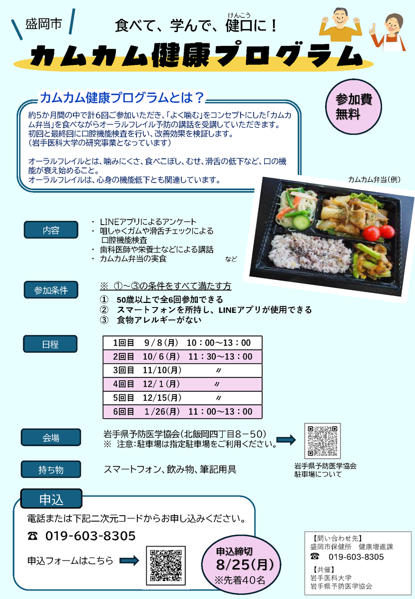 【お詫びと訂正】 8月5日㈫に投稿しました【盛岡市カムカム健康プログラムを開催します】におきまして、添付ファイルの日程に誤りがございました。 正しくは、6回目 1月26日㈪です。 訂正し、お詫び申し上げます。