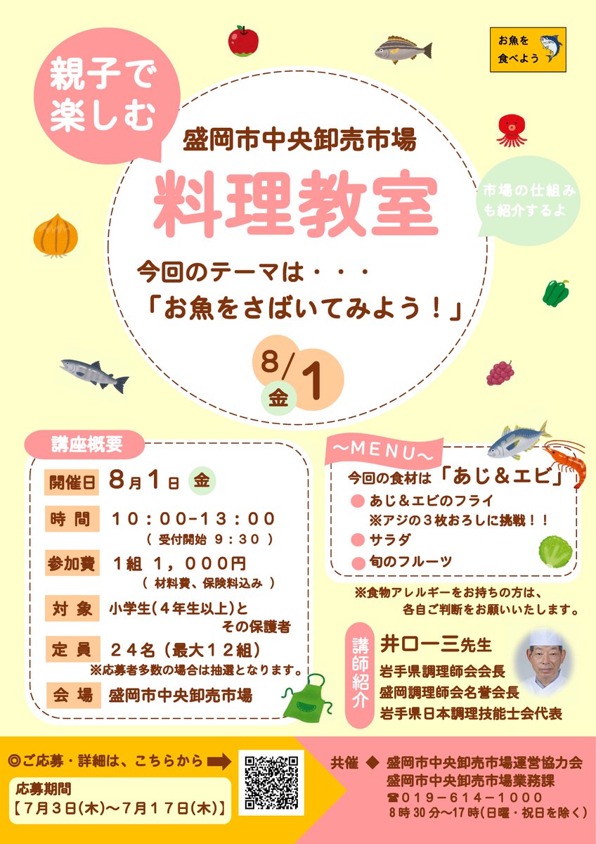 【盛岡市中央卸売市場親子料理教室を開催します!】★テーマは「お魚をさばいてみよう」★アジの三枚おろしに挑戦★アジとエビのフライを作ります。7月3日㈭から応募受付開始します。※小学生(4年生以上)とその..