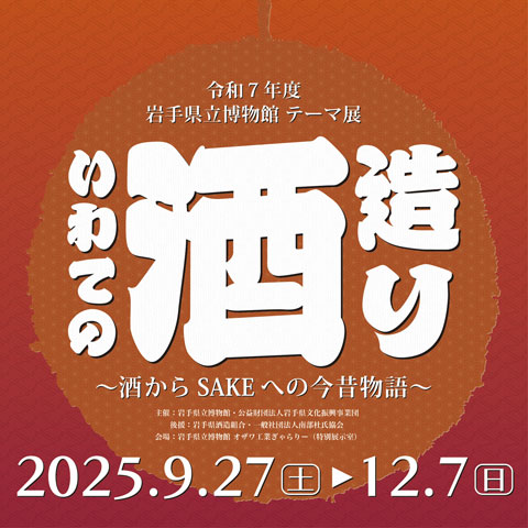 【県博テーマ展のご案内】9月27日(土)から、テーマ展「いわての酒造り~酒からSAKEへの今昔物語~」を開催中です10月26日(日)には、テーマ展担当学芸員の日曜講座と展示解説会を予定しています会期:..