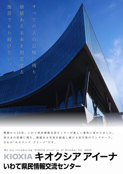 いわて県民情報交流センター「アイーナ」は、新たに「キオクシアアイーナ」として生まれ変わりました。開館から20年、県民に親しまれてきたアイーナは、「すべての人の記憶に残り、価値ある未来を創造する施設」と..