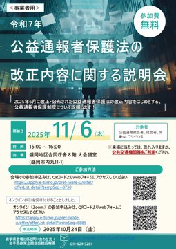 10月6日に投稿した令和7年公益通報者保護法の改正内容に関する説明会についてオンライン(Zoom)による参加も受け付けることとしました。日時:11月6日(木)午後3時~4時対象:事業者等申込方法等は、..