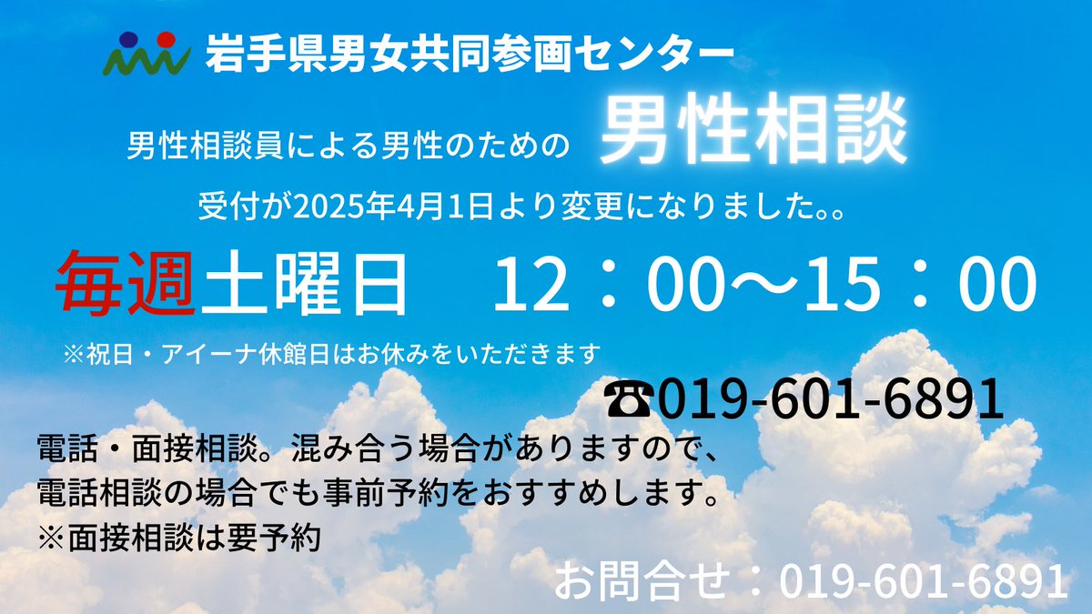 【男性相談員による男性のための男性相談】岩手県男女共同参画センターでは、男性相談を行っています。2025年4月より毎週土曜日に行います。※10/25はお休みです。秘密は厳守します。ひとりで悩まず相談し..