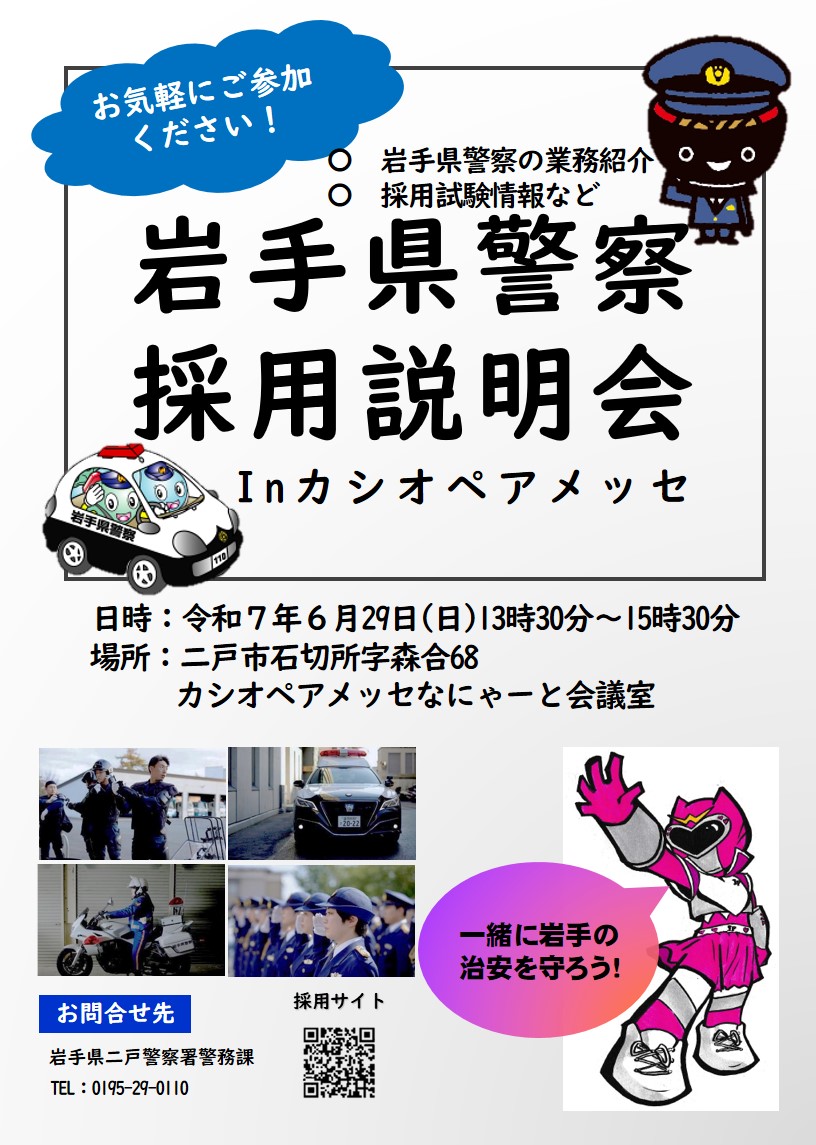 【イベント情報】岩手県警察採用説明会inカシオペアメッセが開催されます!警察の業務紹介・装備資機材の展示・公務員試験対策についてなどなど魅力的なラインナップとなっています!!警察官になりたいという素敵..