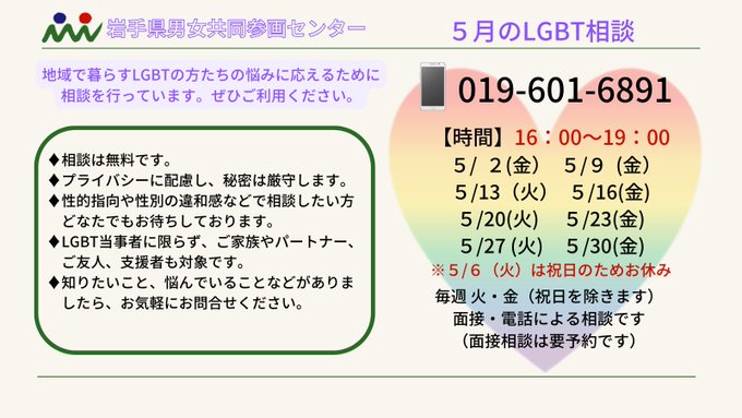 【LGBT相談】岩手県男女共同参画センターでは毎週火・金曜日にLGBT相談を行っています。今週は5/27(火)5/30(金)16:00~19:00です。ご家族やパートナー、ご友人、支援者の方も対象です..