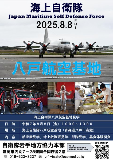 33歳未満の方対象夏休みイベント海上自衛隊八戸航空基地見学8月8日(金)金曜日の海自カレー体験喫食申込みは岩手地本HPから申込期限は7月14日(月) #Pー3C #海上自衛隊