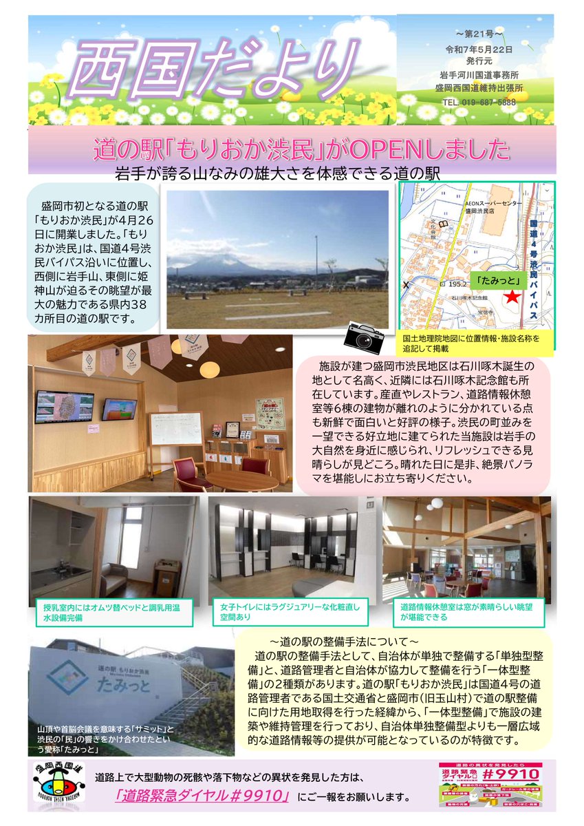 「西国だより第21号」を発行しました。~#道の駅「もりおか渋民」がOPENしました~バックナンバーは、盛岡西国道維持出張所HPをご覧ください。https://thr.mlit.go.jp/iwate/..