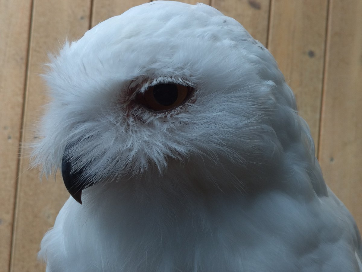 獲物を狙っているかのような鋭い眼差し#岩手サファリパーク#シロフクロウ#フクヤマくん#鳥#雪のような白さ#嘴も鋭い#首は270度回転する#この後エサの時間#オスとメスで羽の色が異なる