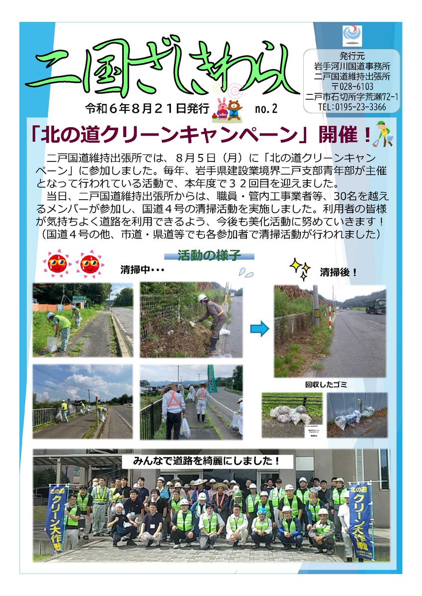 「二国ざしきわらしNO2」を発行しました。~「北の道クリーンキャンペーン」開催!~バックナンバーは、岩手河川国道事務所HPの「出張所コーナー」をご覧ください。https://thr.mlit.go.j..