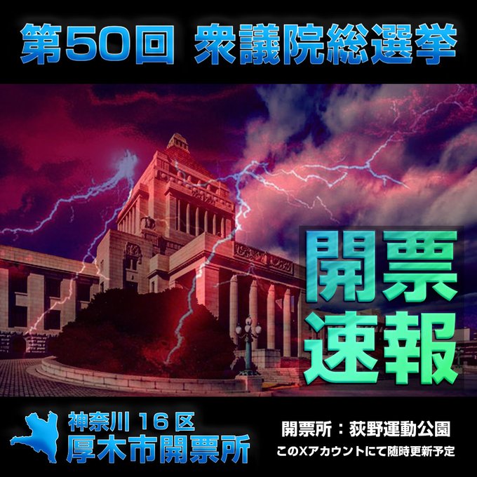 厚木市#開票速報#開票速報中#開票特番衆議院議員選挙神奈川16区(厚木市)※非公式データ※23:35非公式(確定台の束数)後藤祐一15000票義家弘介15000票山本瑞恵4500票伊左次美江6000票..
