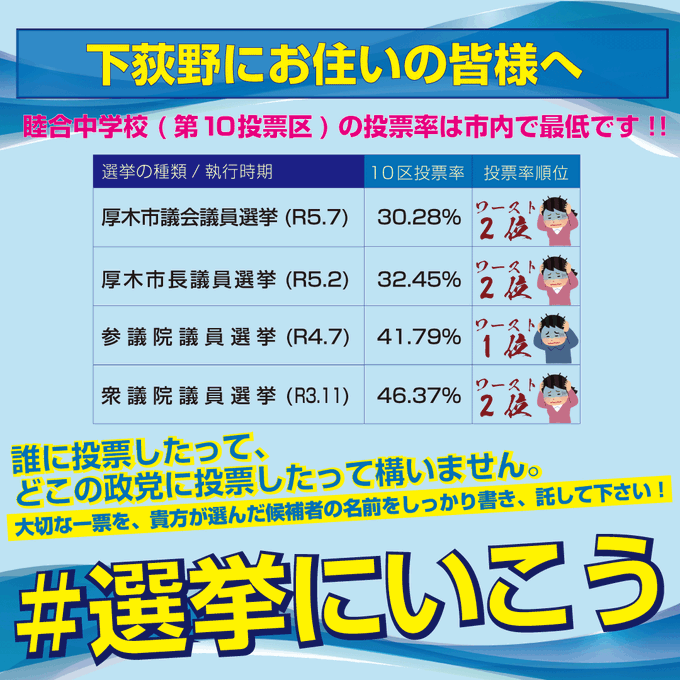 #厚木市#選挙に行って政治を変えよう#選挙にいこう衆議院選挙神奈川16区下荻野にお住まいの皆様へお願い!私の地元でもある、この下荻野。43箇所ある、厚木市内の投票所の中で下荻野は第10投票区、睦合中学..