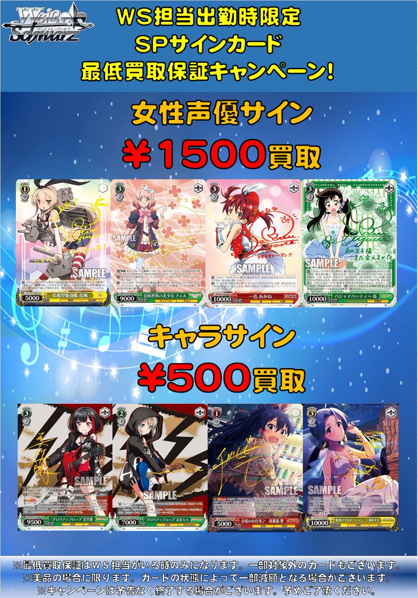 ヴァイスシュヴァルツ本日担当出勤しているのでサインカードの買取保証キャンペーンやってます!持ち込みお待ちしております!000