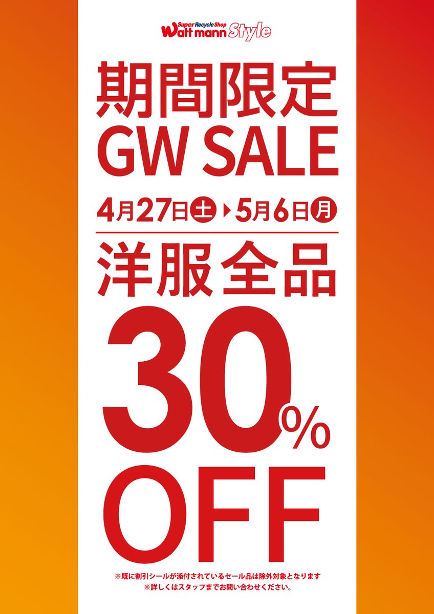 【GW限定キャンペーン🎉】ワットマン本厚木店では4/27~5/6までの期間お洋服が全品30%OFFとなるキャンペーンを実施します!対象となるのはメンズ、レディース衣類、子供服、スポーツウェア、着物と洋..