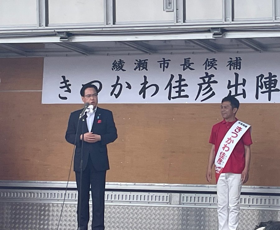 6月30日(日)#綾瀬市長選挙がスタートし、#きつかわ佳彦候補の出陣式に#谷口県議会議員が力強く応援の挨拶を#亀井たかつぐ県議会議員も応援に駆けつけていただきました!私も全力で応援します#綾瀬市