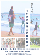 【8月25日開催】#ちがさき保育士就職相談会茅ヶ崎市内に保育所等を持つ求人事業者が、それぞれブースを出展する就職相談会です。参加者は興味のあるブースで、保育所等の担当者に直接、保育理念や保育の特色、勤..