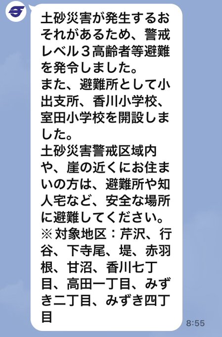 #茅ヶ崎市【避難指示発令】警戒レベル3高齢者等避難対象地域芹沢、行谷、下寺尾、堤、赤羽根、甘沼、香川7丁目、高田1丁目、みずき2丁目、みずき4丁目開設済み避難所小出支所、香川小学校、室田小学校避難に時..