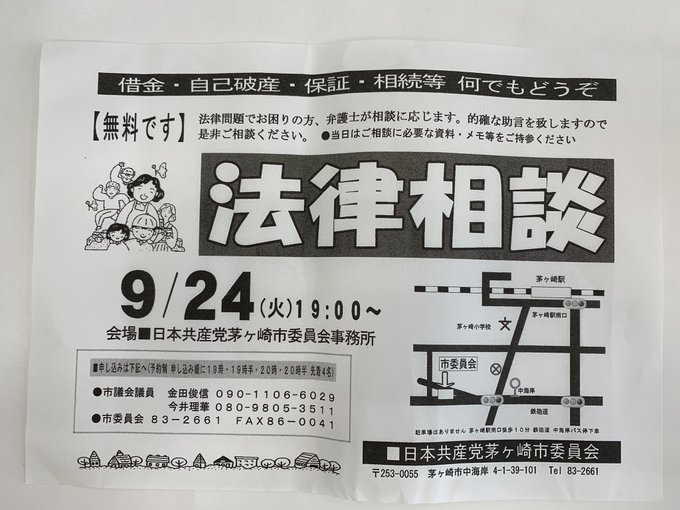 無料!! 【法律相談】 日時:9月24日(火)19時〜 場所:日本共産党茅ヶ崎市委員会事務所 茅ヶ崎市中海岸4-1-39-101 電話:0467(83)2661 予約制:先着4名様限定