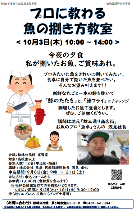 10月3日(木曜日)プロに教わる魚の捌き方教室「#魚卓浅見社長」から鯵のを捌き方を教わり、「#鯵のたたき」と「#鰺フライ」を作ります!費用1,000円(食材費含む)【松林公民館】https://cit..