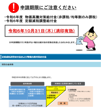 定額減税調整給付金および物価高騰対策給付金給付金の対象の方には、市から申請書類等を送付しました・令和6年度物価高騰対策給付金(非課税世帯/均等割のみ課税世帯):7月19日発送・令和6年度定額減税調整給..