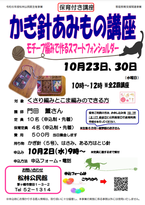 10月23日・30日(水)#かぎ針あみもの講座~モチーフ編みで作るスマートフォンショルダー~【全2回】(松林公民館)こま編みとくさり編みのできる方を対象に、モチーフ編みでスマートフォンショルダーを作る..