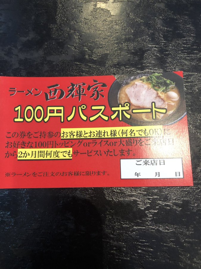 おはようございます。 本日24日西輝家の日です。 2ヶ月間何度でも100円トッピングやライスがつけれるお得なサービス券お配りしております。 11時から22時までご来店お待ちしております。