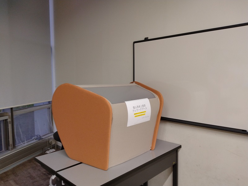 一人で気兼ねなくミーティングなどできるように1Fラウンジに試験的に個人用卓上吸音テレワークブースを1台設置してみました。 ブースは移動させないでその場でご利用ください。そしてご感想などいただけるとありがたいです。(TT)