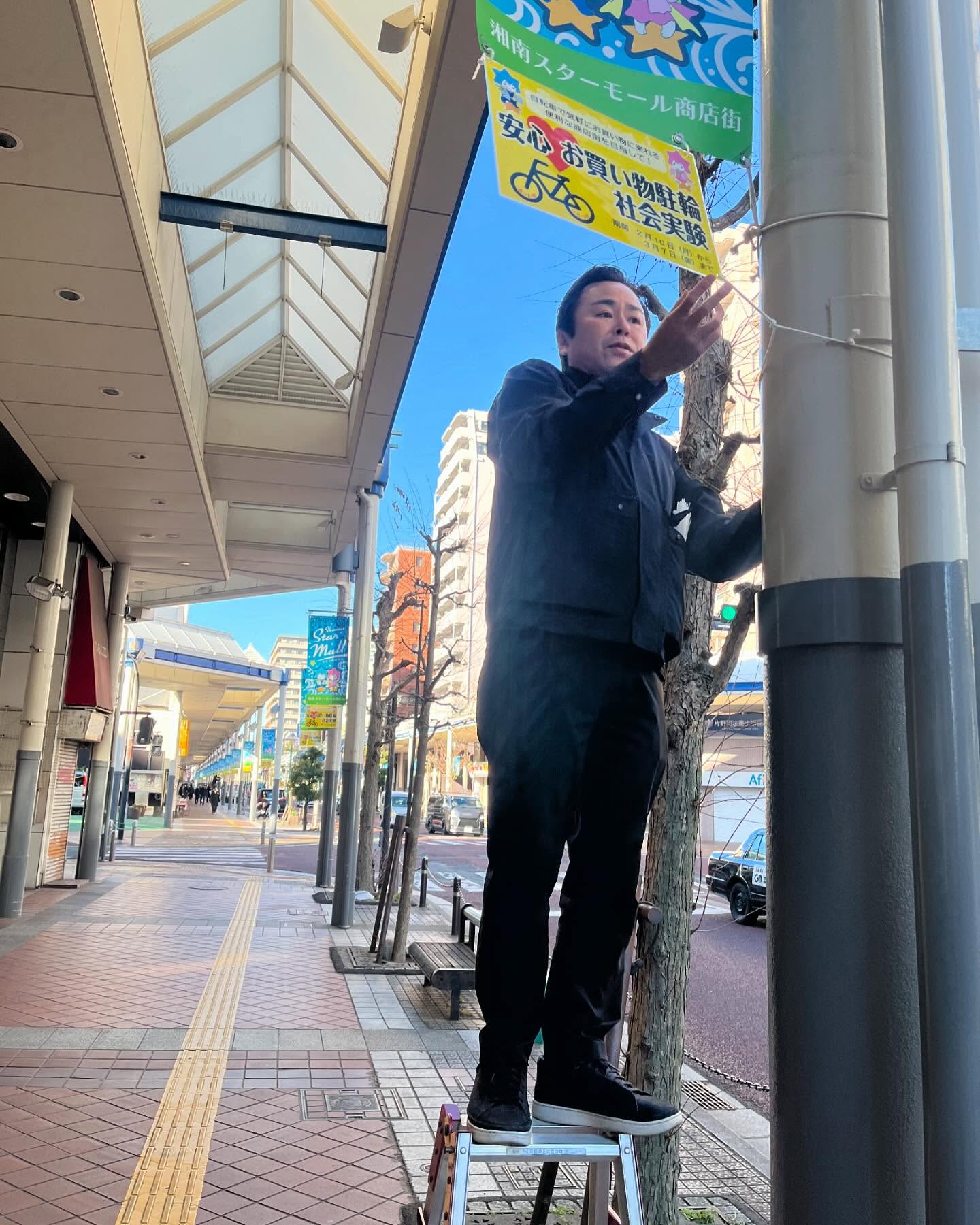 明後日から始まる、スターモール商店街の駐輪社会実験のバナー掲示。2月10日(月)から3月7日(金)まで、参加店舗の店頭付近に自転車を停められるようになります。お店でプレートを受け取ってお買い物中は自転..