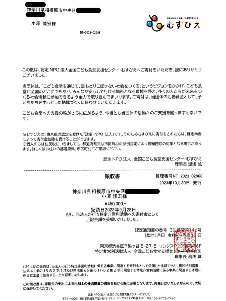 【身を切る改革のご報告】令和5年9月28日#身を切る改革の一環として「特定非営利活動法人全国こども食堂支援センター・むすびえ」様に寄付をしました。#日本維新の会#維新#相模原市#中央区0712