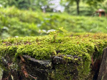 柔らかな陽光が差し込む場所で、#イロハモミジの#実生でしょうか、#朽ちた古木から発芽し、小さな葉をいっぱいに広げています。#津久井湖城山公園