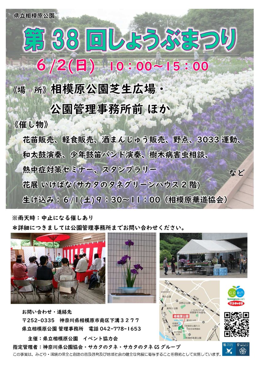 6月2日(日) 本日第38回しょうぶまつりを開催します。一部予定が変更になりましたのでお知らせします。 【雨天予報のため中止の催し】 ニュースポーツ体験 ・和太鼓演奏 ・鼓笛パレード