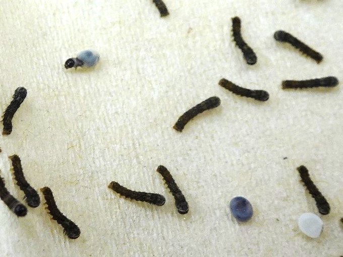 さあ!今年もカイコ展示の季節がやってきました。卵から孵化した#カイコは3~5mm程です。黒い卵はこれから孵化する卵、白いのは孵化した後のカラ、左上にはまさに今、カラから出ようとしているカイコです。頑張..