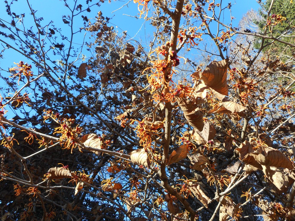 シナマンサクメタセコイアパーゴラ付近前年の枯葉を枝に残したまま咲く花は、マンサクの仲間では最も大きい花です。004