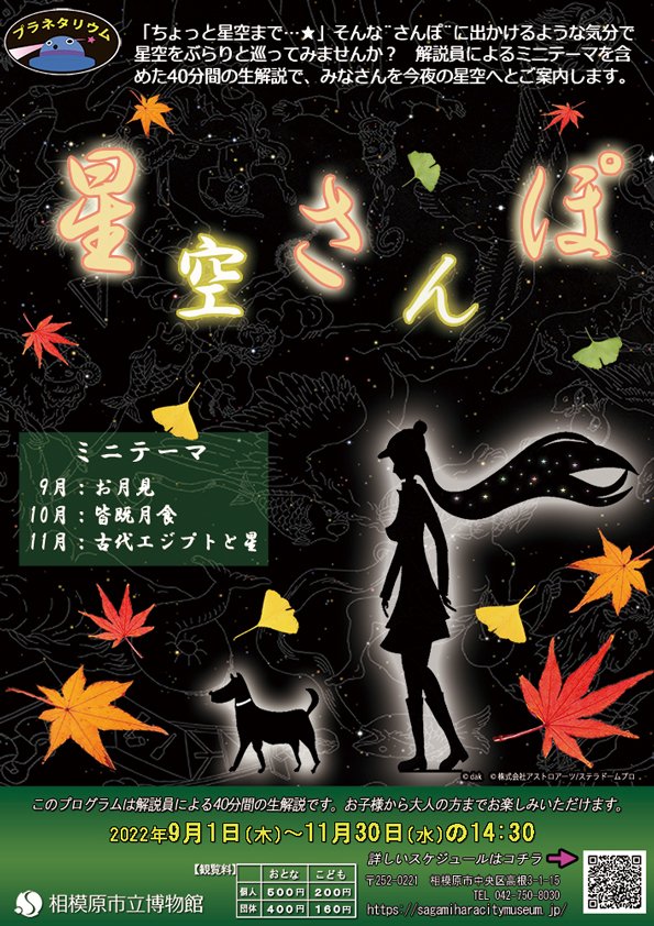 今日(11/22)の#プラネタリウム🌟は14:30【プラネタリウム】星空さんぽ~#秋~ ミニテーマ「古代エジプトと星」16:00【全天周映画】富士の星暦🗻#博物館#科学館#相模原#星座#星空#宇宙..