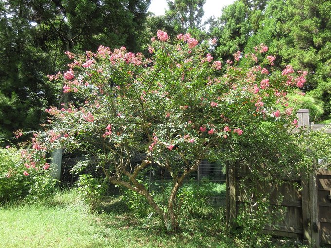 現在民家園では、サルスベリが見頃を迎えています。 濃いピンク色が鮮やかなサルスベリは、園内のあちらこちらに植えてあります。1本だけ、旧北島家の裏手に紫色のサルスベリがありますので、そちらもぜひ探してみてください(写真3枚目)。
