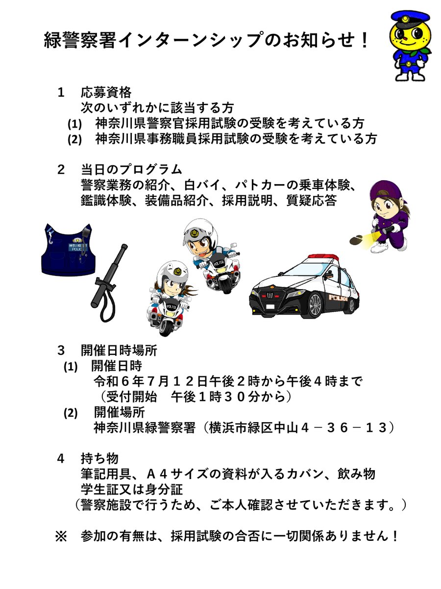 ☆緑警察署インターンシップ☆ 【開催日】令和6年7月12日㈮ 2021年に新庁舎となった緑警察署! 人と仕事に誠実に、ワンチームで働く警察官の姿を知ることが出来るチャンスガル! 希望者は 神奈川県警察採用ダイヤル0120-03-4145 に連絡して予約するリポ♡ #警察官 #事務 #神奈川県警察 #緑警察署
