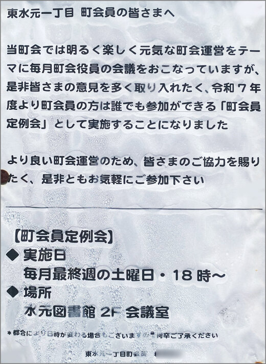 東水元一丁目町会員の皆さまへ 町会員の方は誰でも参加ができる「町会員定例会」にご参加下さい 当町会では明るく楽しく元気な町会運営をテーマに毎月町会役員の会議をおこなっていますが、是非皆さまの意見を多