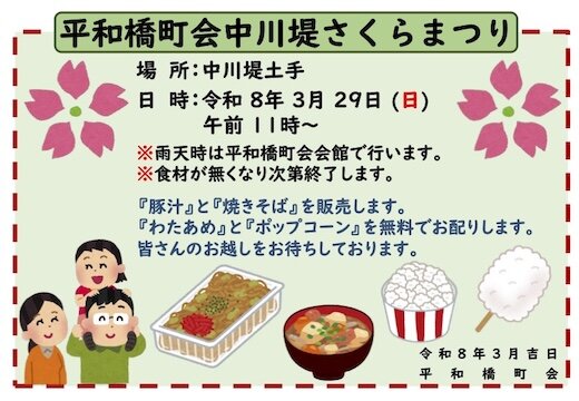平和橋町会中川堤さくらまつり 場 所:中川堤土手 日 時:令和8年3月29日(日) 午前11時〜 *雨天時は平和橋町会会館で行います。