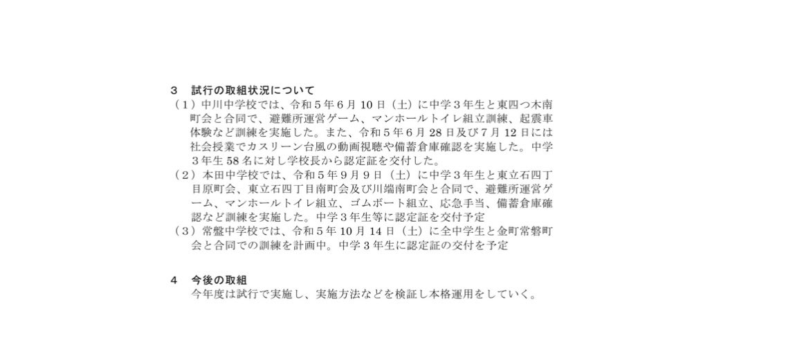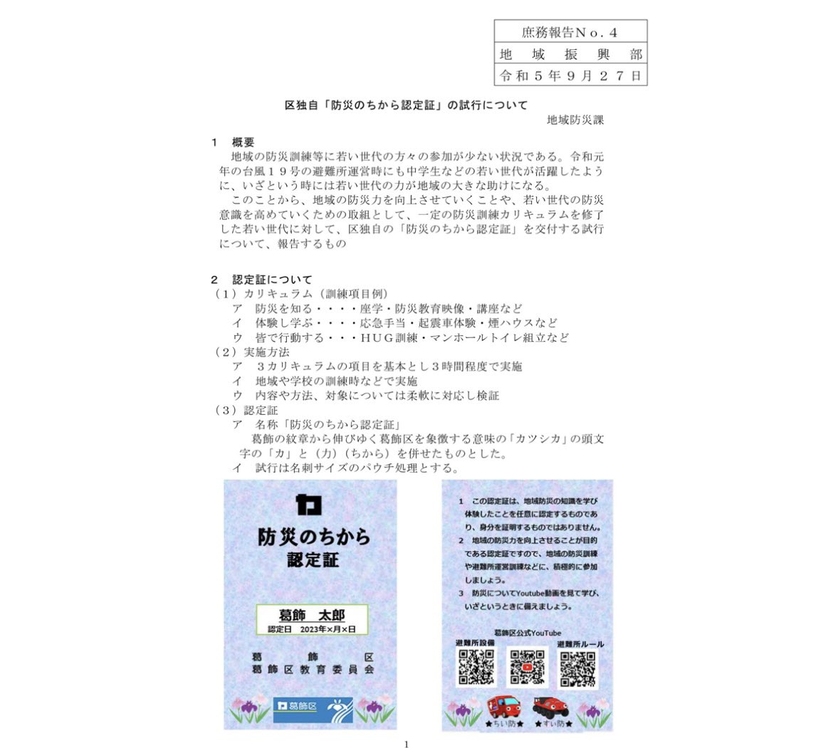 本日は私の所属する危機管理対策特別委員会が開かれ、線状降水帯の発生される場合の対応についてや区が独自に取り組んでいる中学生を対象に試行した「防災のちから認定証」の交付についての報告がありました。