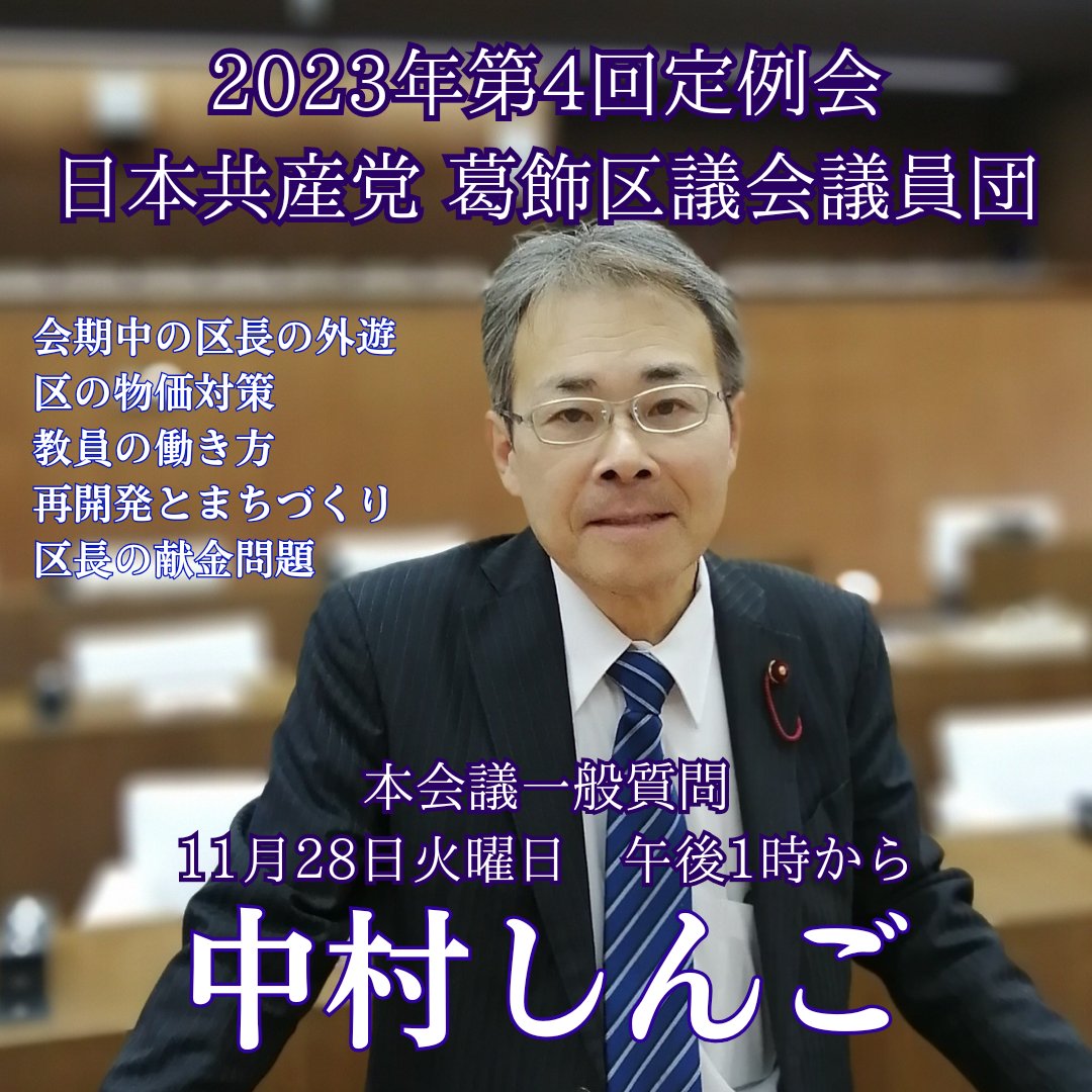 お昼の休憩後、午後1時(予定)から日本共産党の中村しんご議員が一般質問に立ちます。