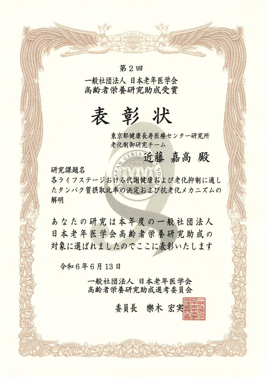 老化制御研究チーム 分子老化制御 研究副部長の近藤 嘉高が日本老年医学会 第2回(2024年度)高齢者栄養研究助成にて受賞しました。 URL: https://tmghig.jp/research/info/archives/015738/index.html… #抗老化 #タンパク質 #日本老年医学会 #受賞 #健康長寿