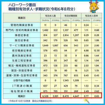 広報担当の #やるシカ です! #ハローワーク墨田 の最新情報をお知らせします 令和6年8月の #有効求人倍率 はフルタイムは0.77倍、パートタイムは0.65倍でした。 就職市場動向について詳しくお知りになりたい方は「しごと発見プラザかつしか」をぜひご利用ください。 https://katsushika-shigoto.net